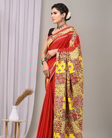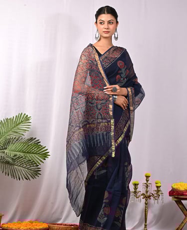 LINEN SAREE- The softlinen fabric drapes beautifully whiletheintricate block prints add timeless charm.